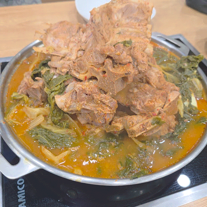 드디어 마주한 감자탕! 사진을 보시면 아시겠지만, 냄비 위로 뼈다귀가 '폭발할 듯' 쌓여 나옵니다. 요즘 같은 고물가 시대에 이렇게 푸짐하게 뼈를 쌓아주는 곳은 드물죠.