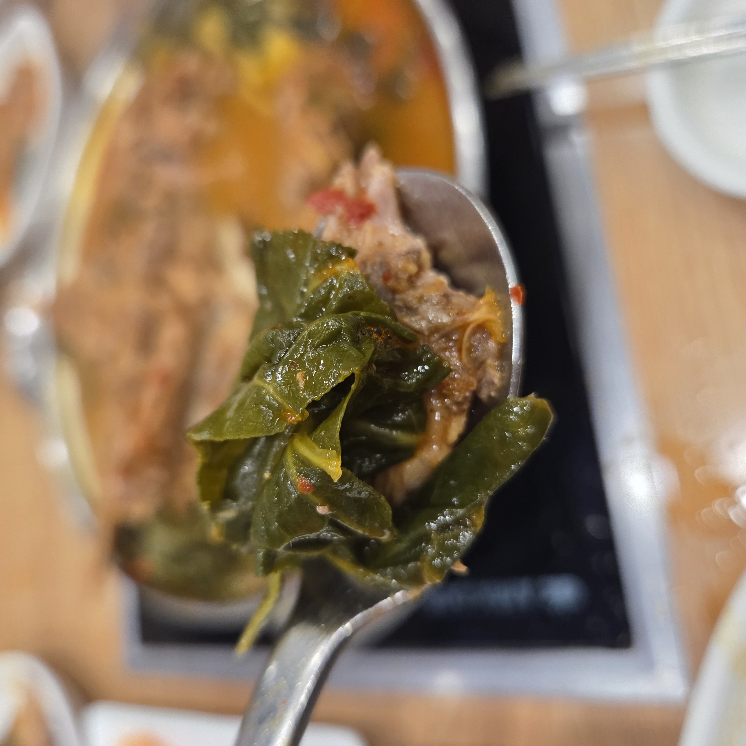 산더미 시래기: 고기 위에 얹어진 부드러운 시래기는 국물을 듬뿍 머금고 있어 씹을 때마다 깊은 맛이 배어 나옵니다.